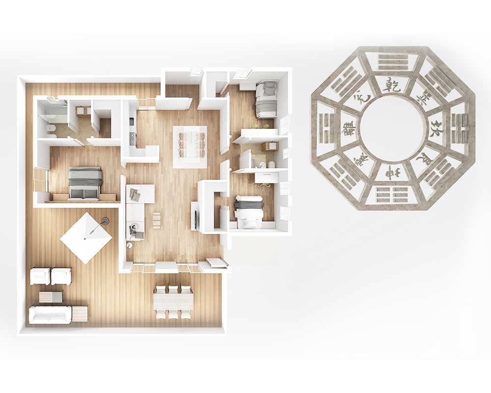 「風確 Fuukaku」では、 家相で使われる「三所に三備を設けず」という考えを元に、主採光の向きと欠けの有無などを考慮しています。