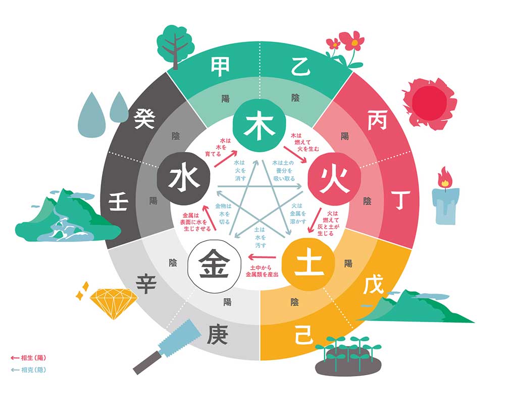 五行はその性質の組み合わせで、相生(そうしょう)、相剋(そうこく)、比和(ひわ)